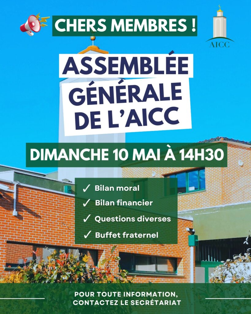 Le conseil d’administration de l’association Islamique et Culturelle du Calvados (AICC) a plaisir de vous convier à son  assemblée générale (AG) qui se tiendra le 10/05/2026 à partir de 14h30 à la mosquée d’Hérouville Saint Clair.